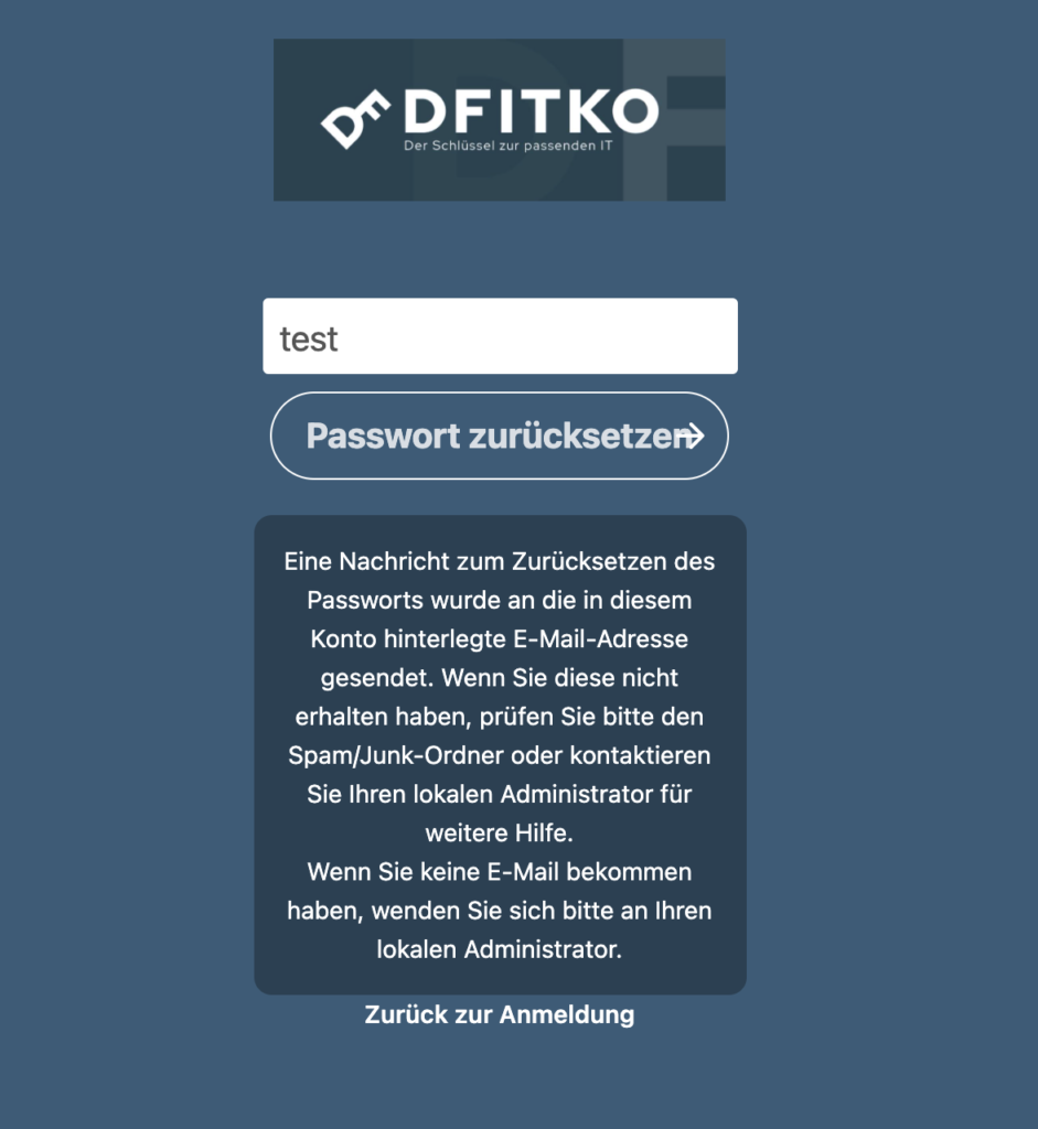 Mit Klick auf „Passwort vergessen“ kann das Passwort geändert werden. Der Benutzer muss eingegeben werden. Danach auf „Passwort zurücksetzen“ klicken.