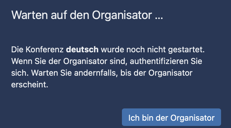 Wenn man der Organisator der Konferenz ist, bitte mit Klick auf den Button „Ich bin der Organisator“ bestätigen. Ohne Teilnahme des Organisator funktioniert die Konferenz nicht.