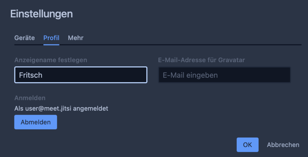 Hier kann z. B. der Anzeigename geändert werden. Man kann sich auch mit dem Button „Abmelden“ aus der Konferenz abmelden.